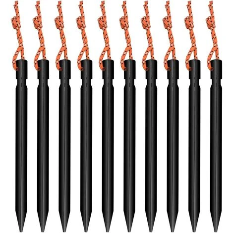 - ăLot de 10ă: Le forfait comprend 10 clous de piquet de tente, de couleur noire. La taille du clou de sol en mĂ©tal est de 18 cm / 7,08 pouces. Chaque ongle ne pĂšse que 13g, facile Ă transporter.