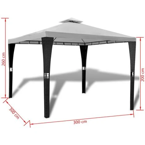 Cette tonnelle est idéale pour tout évènement extérieur, comme des spectacles, mariages, fêtes, barbecues, festivals, ect. Vous pouvez également l’installer dans votre jardin comme un grand parasol pour votre famille et vos invités. Le châssis léger et résistant à la rouille est en acier peint par poudrage. Le design en polyrotin tissé donne à cette tonnelle un look chic et attractif. Le toit en polyester résistant aux UV et à la déchirure est résistant à l’eau et très durable. La construction à double toit permet à l’air de circuler lors des journées chaudes. Cette tonnelle est très durable. Le montage est très facile. Cette tonnelle a des trous dans ses pieds et peut être facilement fixée au sol avec des cordes ou des clous (non inclus dans la livraison). Veuillez noter que nous recommandons de traiter le toit avec un spray imperméable si la tonnelle est soumise à des fortes pluies.