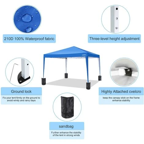 - Les verrous au sol et les pieds ancrables avec sac de sable donnent à ce gazebo un bon support. Les coins promettent une fixation facile des lignes et des poteaux et augmentent la stabilité sous la pluie et le vent.