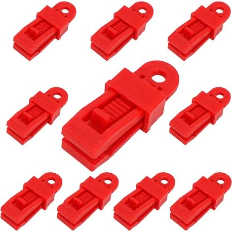Lot de 20 clips de tente rouges de 83 mm x 25 mm x 13 mm, la bouche en forme de roue dentée veille à ce que le clip mordre fermement la bâche. Il y a un trou de l’autre côté qui permet de connecter des boutons ou des câbles métalliques.