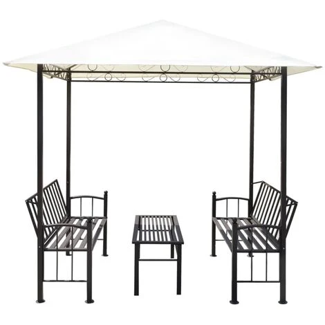 Créez instantanément une retraite confortable dans votre jardin avec cet ensemble de pavillon complet. L’ensemble se compose d’un pavillon avec un cadre en acier robuste et d’un auvent durable, imperméable et anti-UV avec des coins renforcés qui vous garderont, vous et vos invités, au frais sous le soleil et au sec sous la pluie. Les bancs confortables avec leurs dossiers légèrement inclinés et la table à thé pratique sont également faits d’acier durable. REMARQUE : ce produit ne doit JAMAIS être utilisé par mauvais temps, tel que vent fort, pluie abondante, neige, tempête, etc.