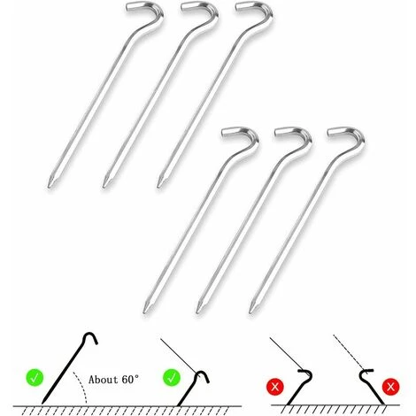 【Facile à utiliser】 Utilisez simplement un outil simple pour enfoncer le bout pointu du clou de la tente dans le sol. L’angle par rapport au sol doit être d’environ 60 degrés et la distance par rapport au sol doit être d’environ 3 cm.