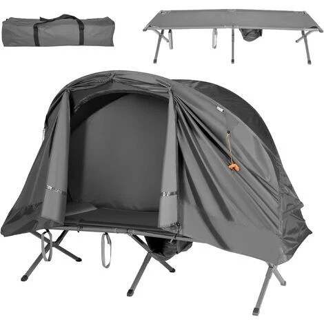 - Tente dispose d’un lit de camping surélevé, un tapis de couchage et un auvent de pluie