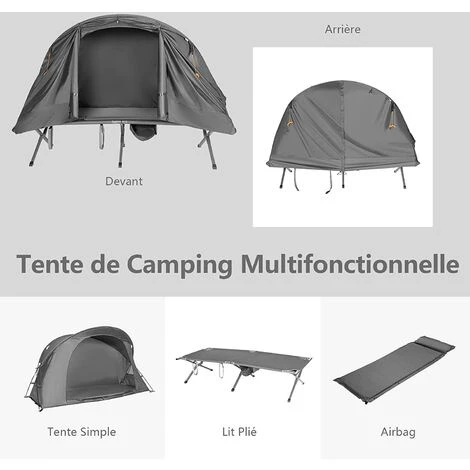 - Notre tente extérieure 4 en 1 dispose d’un lit de camping surélevé, un tapis de couchage et un auvent de pluie, qui peuvent tous être utilisés seuls en fonction de vos besoins. Cette tente pliable peut être placée dans le coffre de la voiture, ce qui facilite son déplacement. N’hésitez pas !