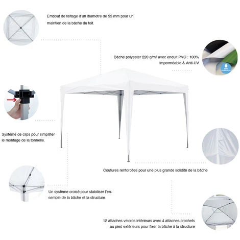 * 12 attaches velcros intérieurs avec 4 attaches crochets pour fermement fixer la bâche à la structure