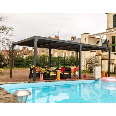 Pergola bioclimatique PER 3660 BI structure en aluminium protégée par un revêtement époxy, avec 156 lames ovales 90 mm à ouverture avec une manivelle.
