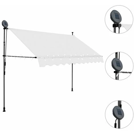 Cet auvent rétractable sera idéal devant la fenêtre, sur la terrasse, le balcon ou dans votre jardin. Cet auvent hydrofuge et anti-salissure et résistant aux UV et aux intempéries est fabriqué en polyester de qualité avec un revêtement PU. Le cadre en acier fort rend l’auvent robuste et durable. L’auvent en polyester facile à nettoyer peut être retiré et lavé. Grâce à la manivelle de la poignée, ce store est rétractable. La hauteur et l’angle du store peuvent également être ajustés. De plus, les lampes LED alimentées par l’énergie solaire permettent d’économiser l’énergie la nuit. L’auvent est facile à assembler. Cet auvent est le choix idéal pour votre espace de vie extérieur et peut être actionné manuellement.