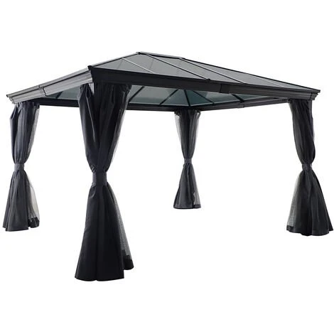 La tonnelle de jardin Belize vous mettra à l’abri des rayons du soleil comme des averses fines de l’été.Elle est idéale pour être installée au-dessus d’une table à manger extérieure, d’un salon de jardin et même d’un spa gonflable. Cette grande tonnelle possède un toit résistant transparent en polycarbonate pour une touche moderne dans la jardin.Son avantage ? La tonnelle Belize est équipée d’un jeu de 4 rideaux et de 4 moustiquaires qui vous protégeront le soir venu des moustiques et autres insectes volants.Fabriquée pour durer, cet abri possède une structure en aluminium pour une grande solidité contre les intempéries. Le toit en polycarbonate lui confère une grande résistance aux chocs.