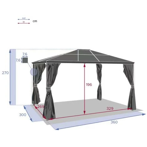 - Dimension de la tonnelle (L x l x H) : 360 x 300 x 270 cm