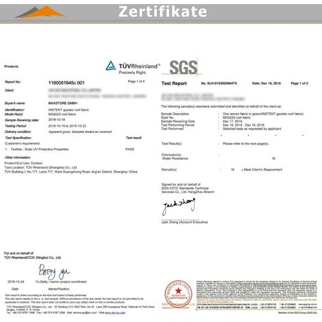 Le toit de la structure est impermĂ©able: environ 200 g/ m² polyester (avec revĂŞtement PVC supplĂ©mentaire), les coutures sont scellĂ©es et la colonne d’eau est de 1500 mm selon DIN EN ISO 811: 2018 (testĂ© par SGS). Elle est aussi dotĂ©e d’une protection UV50+: le matĂ©riau de toiture spĂ©cialement imprĂ©gnĂ© bloque 98% des rayons UV du soleil, facteur de protection solaire UPV 50 selon DIN EN 13758-1: 2007 testĂ© par TĂśV Rheinland.
