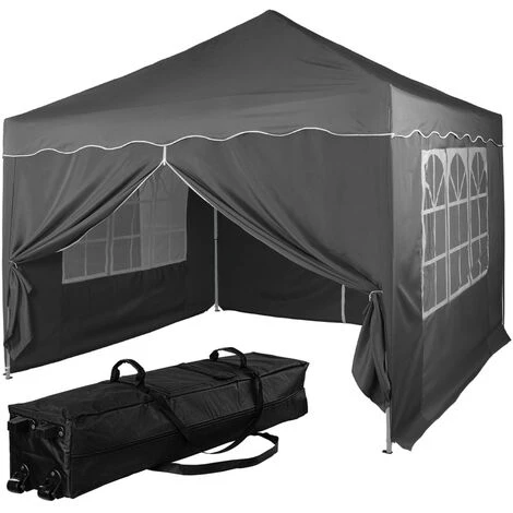 Cette tonnelle pliable INSTENT “Basic” 3x3m contient 4 panneaux latéraux dont 2 panneaux latéraux avec fermeture éclair et 2 panneaux latéraux avec 3 fenêtres.