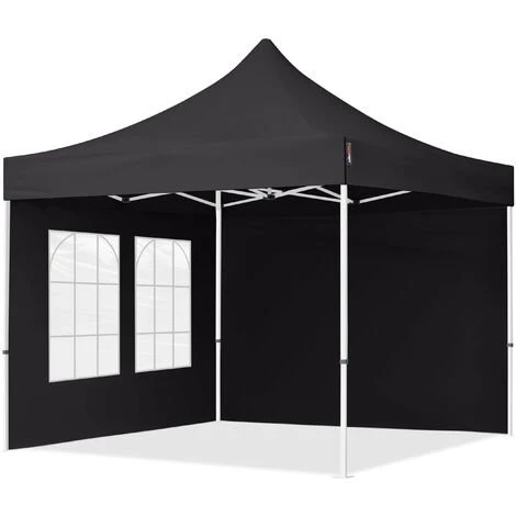 La tente pliante TOOLPORT 3×3 m ECONOMY de couleur noir (2 toiles latérales incluses) se monte rapidement et se transporte facilement Grâce aux housses de transport inclues dans la livraison. Il est possible de régler la hauteur de côté entre env. 2,00 – 2,20 m (3 réglages possibles). L’armature en Acier est stable et solide. Grâce au mécanisme en ciseau, la tente pliante peut être montée et démontée en un tour de main et sans aucun outil. La toile en Polyester haute qualité d’env. 300 g/m² d’épaisseur est robuste et offre un abri contre le soleil et les averses. La tente pliante peut par exemple servir d’entrée abritée, de pavillon de jardin ou de point de vente. Elle est particulièrement adaptée pour vos salons, fêtes ou expositions. Rangée dans sa housse de transport, la tente pliante est très peu encombrante. Des piquets pour sol meuble et des attaches assurent l’ancrage au sol.