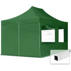 La tente pliante 3×4,5m ECONOMY de couleur vert foncé (4 toiles latérales incluses) se monte rapidement et se transporte facilement Grâce aux housses de transport inclues dans la livraison. Il est possible de régler la hauteur de côté entre env. 2,00 – 2,20 m (3 réglages possibles). L’armature en Acier est stable et solide. Grâce au mécanisme en ciseau, la tente pliante peut être montée et démontée en un tour de main et sans aucun outil. La toile en Polyester haute qualité d’env. 300 g/m² d’épaisseur est robuste et offre un abri contre le soleil et les averses. La tente pliante peut par exemple servir d’entrée abritée, de pavillon de jardin ou de point de vente. Elle est particulièrement adaptée pour vos salons, fêtes ou expositions. Rangée dans sa housse de transport, la tente pliante est très peu encombrante. Des piquets pour sol meuble et des attaches assurent l’ancrage au sol.