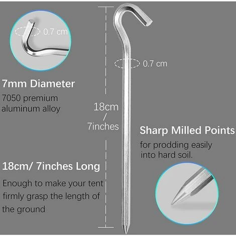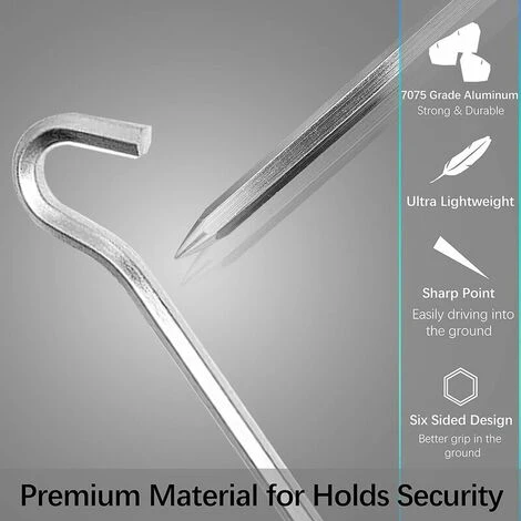 Utilisation polyvalente: Les piquets de tente sont utilisĂ©s pour les tentes, les baches, les dĂ©flecteurs de vent, les mats, les lignes, les filets et bien d’autres choses qui doivent ĂŞtre maintenues en un seul endroit et en une seule position sur le sol au moyen de cordes.