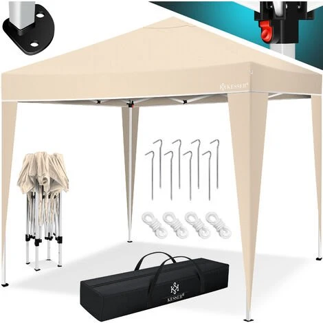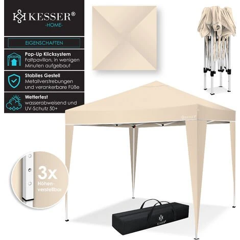 Le jardin est l’endroit idĂ©al pour se dĂ©tendre tout simplement, pour se sentir bien ou pour passer des journĂ©es agrĂ©ables avec votre famille et vos amis. Mais souvent, ces moments prennent fin dès que le mauvais temps s’installe. Avec notre pavillon de la marque KESSER, vous pouvez continuer Ă organiser des anniversaires, des barbecues et d’autres fĂŞtes sans problème dans votre jardin en cas de pluie. Que ce soit dans le jardin, sur la terrasse, lors d’une fĂŞte, d’une manifestation, d’une brocante ou d’une sortie : nos tentes pliantes KESSER vous offrent toujours et n’importe oĂą l’abri parfait.  Grâce Ă sa construction stable et Ă son sac de transport fourni, il est très facile de transporter cette tente pliante partout et de la monter en quelques minutes. Des entretoises mĂ©talliques et des pieds ancrables confèrent Ă ce pavillon une excellente stabilitĂ©. La toile supĂ©rieure du toit est constituĂ©e d’une composition textile pure et impermĂ©able d’Oxford 220D 100 % polyester.Â