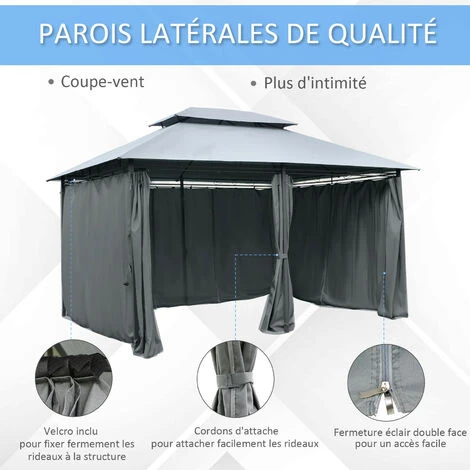 Chic et élégante, la tonnelle Ming de MYCOCOONING séduit par son architecture majestueuse. Son double toit permet une bonne ventilation et empêche la prise au vent qui peut tordre la structure. Elle est équipée de 6 rideaux latéraux zippés qui peuvent être fixés avec des cordons d’attache. La structure en acier époxy anticorrosion est robuste et son style esprit fer forgé lui donne beaucoup de cachet. La toile en polyester haute densité est perforée en 8 endroits afin d’éviter la formation de poches d’eau lorsqu’il pleut. 12 piquets d’ancrage sont fournis pour une parfaite stabilisation.