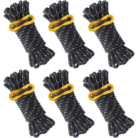 Quantité et taille: 6 cordes de tente sont incluses au total, chaque corde mesure 4 m de long et 5 mm de diamètre.Peut supporter une forte force de traction, avec une excellente stabilité et pas facile à déformer.