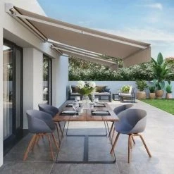 BEAU RIVAGE Store Banne Motorisé Semi Coffre 3,90 X 3m En Aluminium, Structure Blanche , Toile Taupe BEAURIVAGE