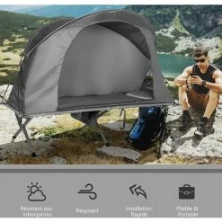 GOPLUS Lit De Camping Avec Auvent De Pluie,Tente Extérieure Pour 1/2 Personne, Tente Pliable Avec Lit Surélevé,Tapis De Couchage Et Sac De Transport,Charge Maximale 150KG (1 Place, Gris)