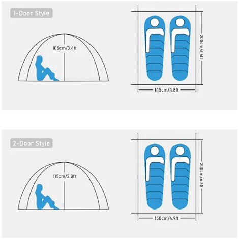 Taille de la tente à deux portes : env. 200 * 150 * 115cm / 6.6 * 4.9 * 3.8ft