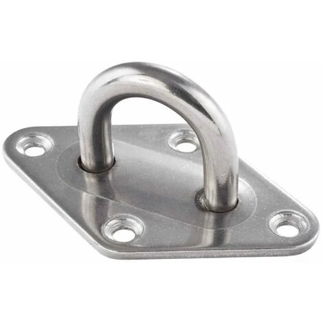 Pontet inox sur platine en forme de losange pour la fixation de voile d’ombrage et la création d’un point de fixation sur un mur. Point d’ancrage en inox résistant aux intempéries.